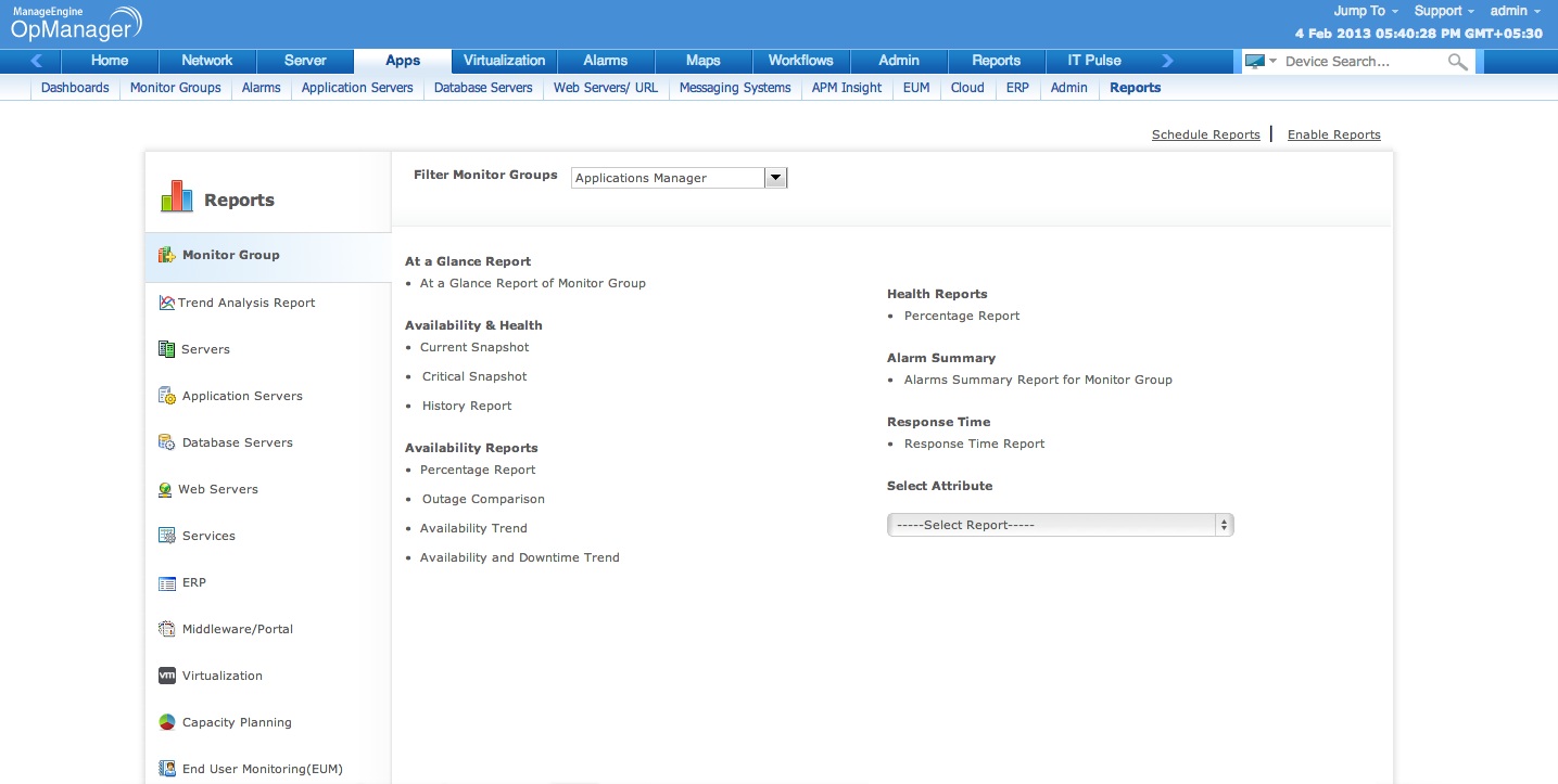 报表模块可以授权给业务经理。这些报表可以帮助管理员对应用执行故障监测和容量规划。同时,您还可以通过报表来分析您的应用服务器、数据库服务器、自定义应用、自定义脚本、服务,而所有这些,您都不要额外的进行配置。
