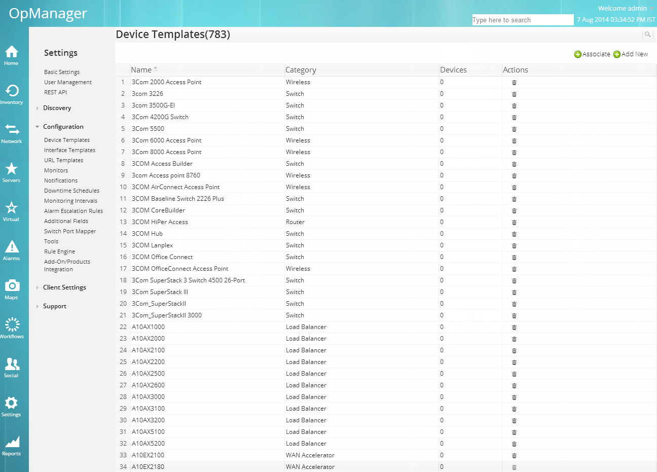 如果网络中包含大量的设备,分别对每个设备配置监控参数和间隔将十分麻烦。为此,OpManager提供了设备模板,每个模板预定义了一类产品的监控参数和监控间隔。OpManager默认支持600多种设备,每个设备类型有一个模板。