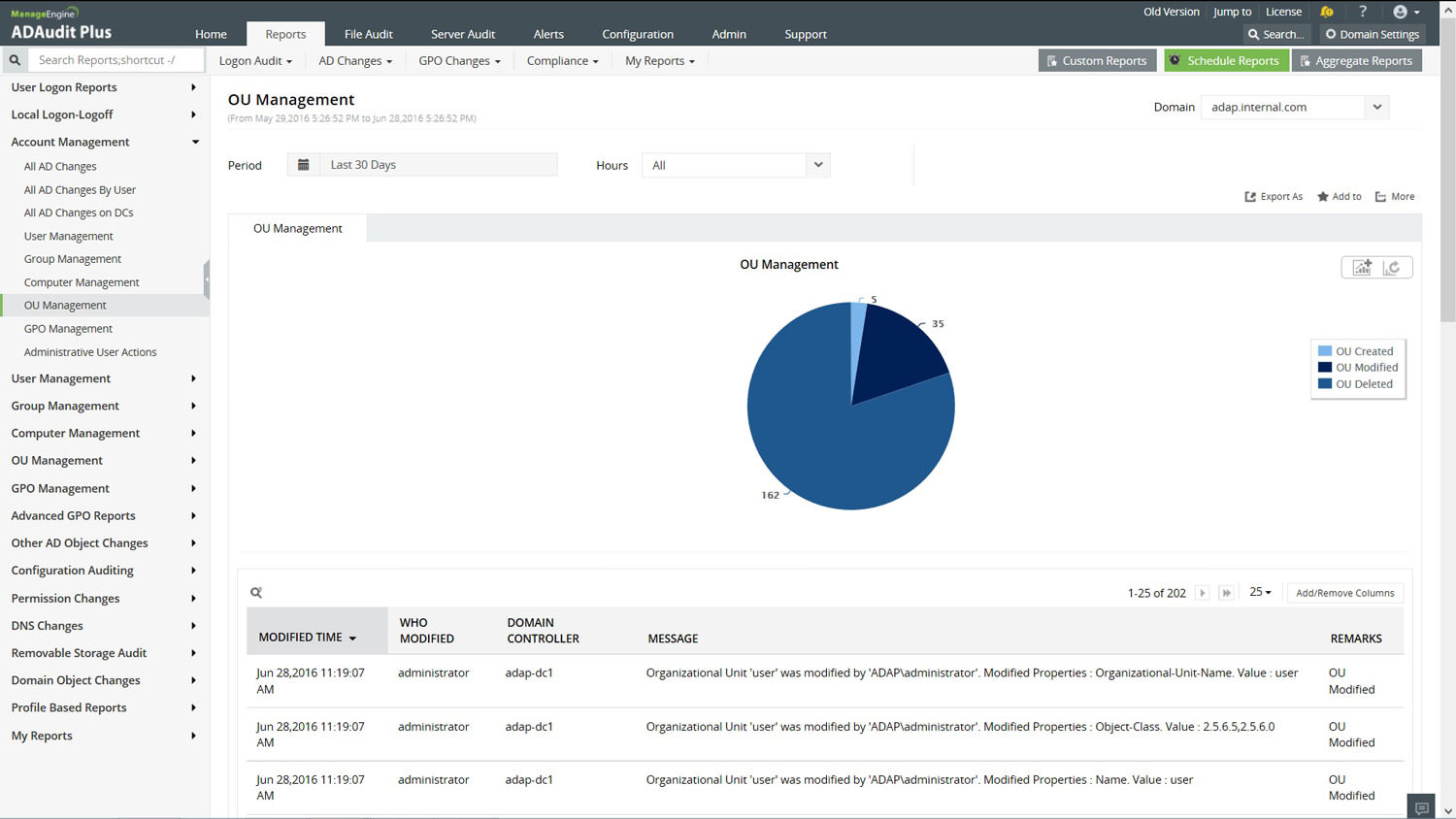 使用来自以上任一Active Directory审计报表的报表创建新报表配置文件。选择要审计的对象操作。而且,选择域和其中要与报表配置文件关联的对象。 |