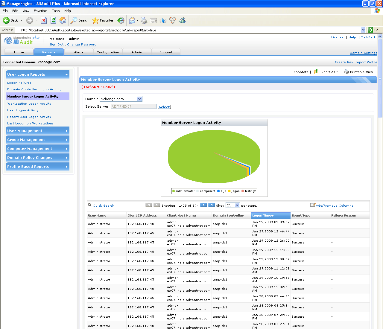ADAudit Plus提供有关登录失败、域控制器登录活动、成员服务器登录活动、工作站登录活动、用户登录活动、最近用户登录活动以及最后一次登录工作站等方面情况的用户登录报表。此外,该登录审核解决方案也是一个不可或缺的工具,使得特定登录事件、当前和过去登录活动的审核变得容易,并可列出所有与登录相关的变化。它通过易于理解的Web界面来实现,并通过图表、图形以及内置自定义报表的列表视图来显示统计信息。