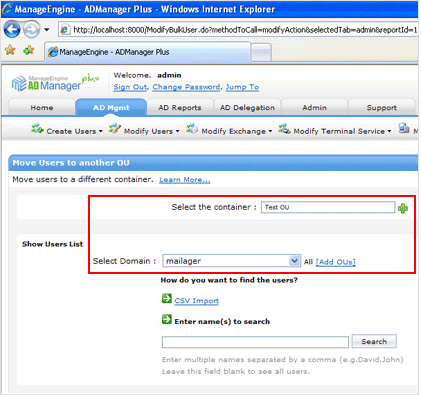 Move users from the generated reports page of ADManager Plus. i.e., generate a Inactive User or Disabled Users report and move them to the appropriate container.An illustration of moving Active Directory users from one OU to another: