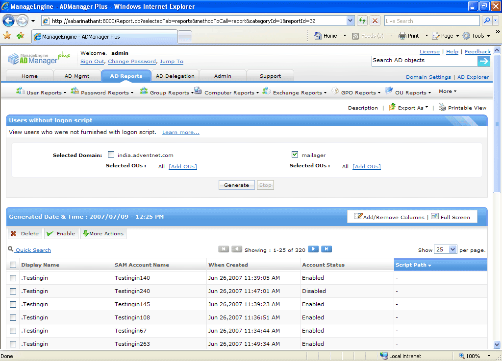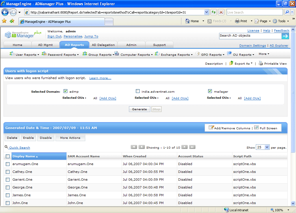 ADManager Plus提供超过150个预定义的报表,让您只需点击几下即可查看重要信息。您甚至可以配置报表自动生成并发送到特定电子邮件地址。此外,您还可利用其导出选项将所需的报表导出为所选的格式:PDF、excel、CSV、CSVDE或HTML。ADManager Plus的报表是可付诸实施的,也就是说,您可以直接从这些报表内执行所需的管理操作。例如,在查看AD环境中的不活跃用户时,您可以选择禁用它们。这些报表还帮助您满足甚至超出SOX、HIPAA等的合规要求。