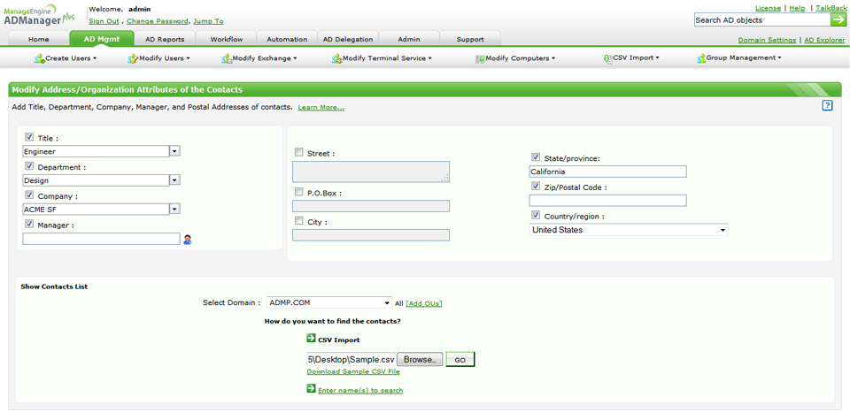 In this option, you will just have to mention the list of all contact objects that have to be modified along with the new values for those attributes to be modified in a CSV file and import the file into ADManager Plus to modify all the required contact objects.