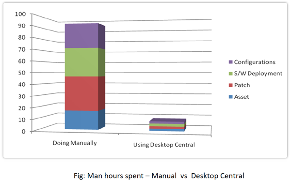 The graph shown above is for doing these tasks just once. When you increase the number of times you perform these tasks, you would tend to save even more as most of these taks gets automated in Desktop Central.