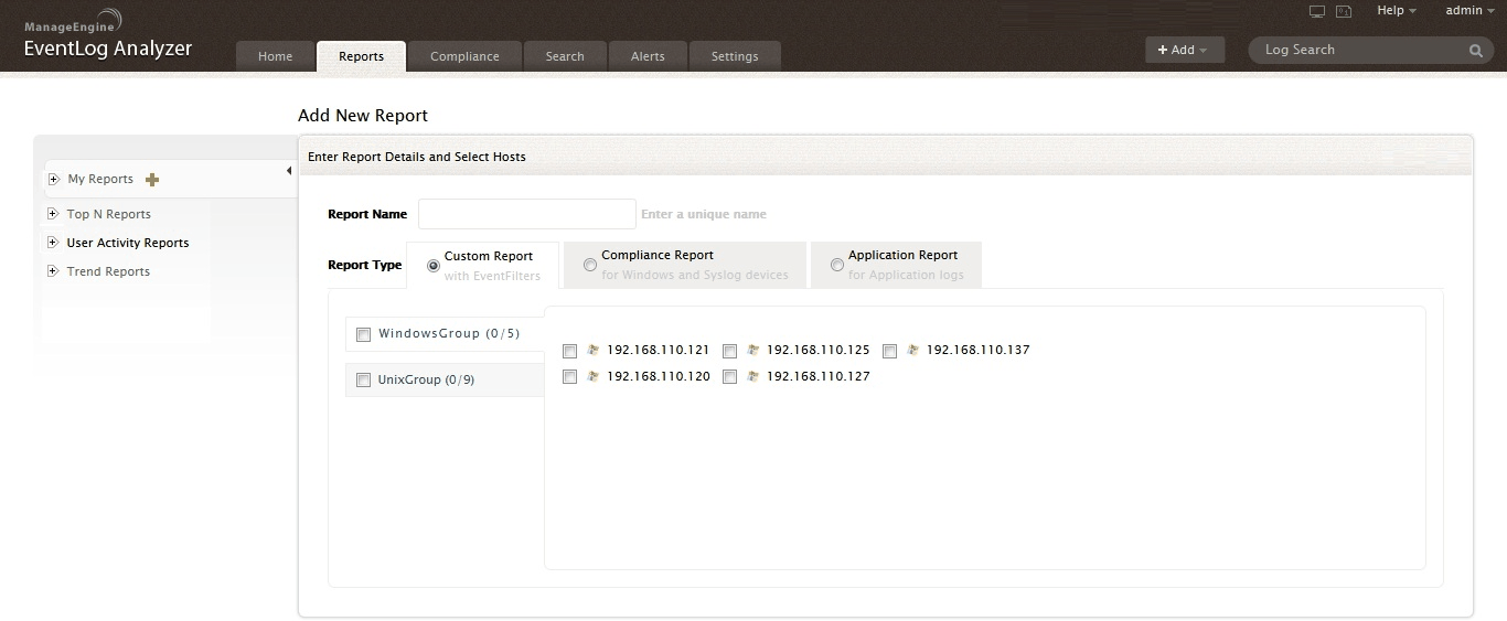 EventLog Analyzer允许您自定义报表。有了此功能,您将能够修改预建报表以满足您的要求。如果它适合您的要求,您可以自定义现有的预建报表,而无需创建自己的自定义报表。 |