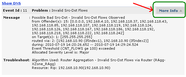 事件明细页面右上方的“更多信息”,提供全部入侵者、目标和接口名称列表。它也会提供使用的算法和路由名称的信息。