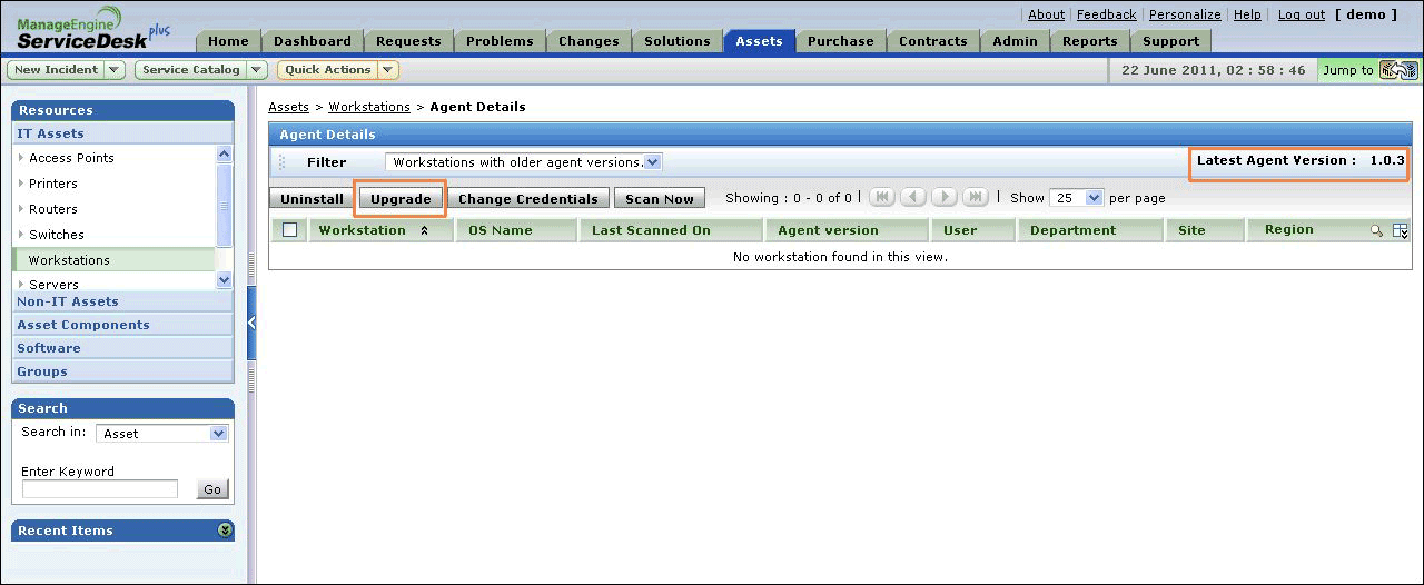 When a service pack is released and you want to check the new agent version, click Assets tab -> Older Agent Versions link. [An agent with version 1.0.5 is already installed in a workstation. What will happen if I try to install an agent with a below version, same version or above version?