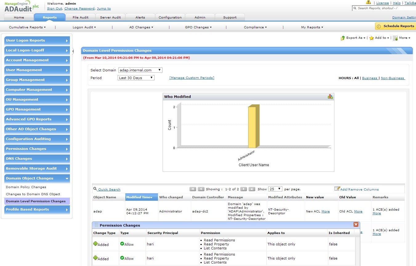 使用来自以上任一Active Directory审计报表的报表创建新报表配置文件。选择要审计的对象操作。而且,选择域和其中要与报表配置文件关联的对象。 |