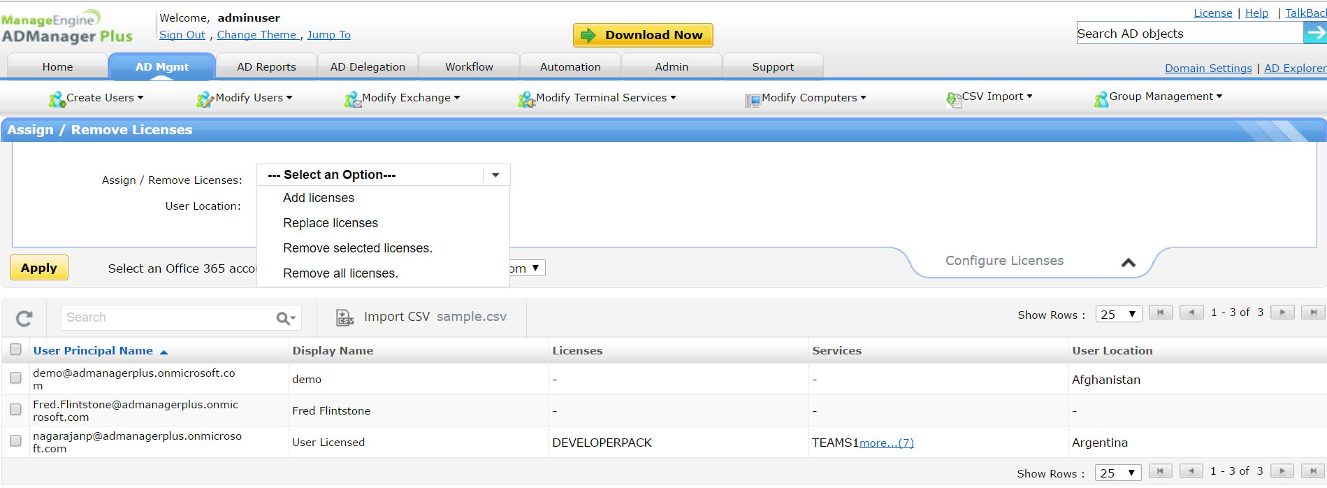 ADManager Plus is a web-based tool that lets you manage your users' Office 365 licenses easily without writing PowerShell scripts, as you can see in Figure 1. You can manage these licenses individually or in bulk with just a few clicks.