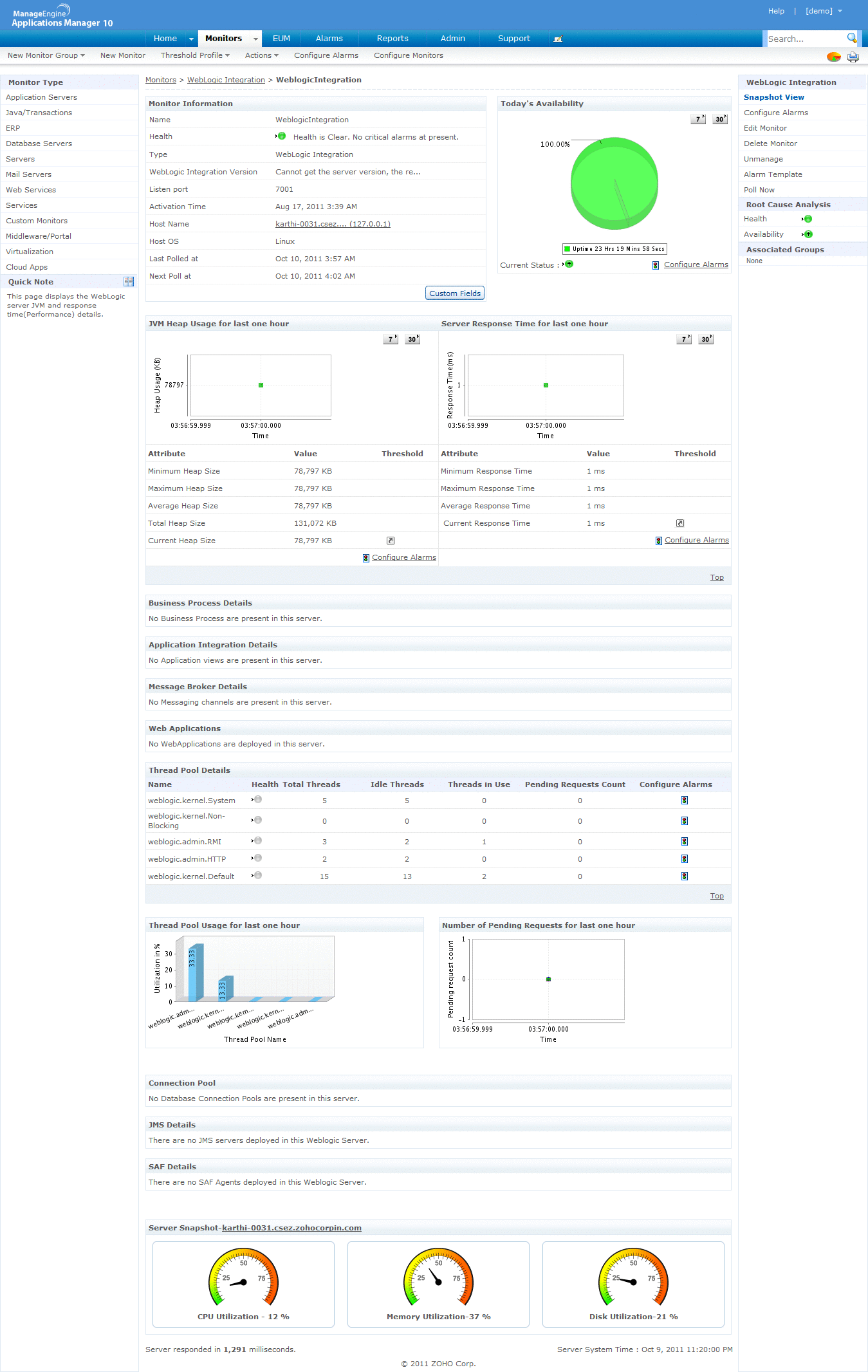 Applications Manager可以自动诊断、通知和纠正WebLogic Integration服务器,以及整个IT架构中的服务器和应用程序的性能和可用性的问题。