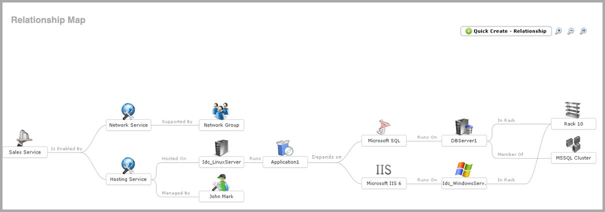 AssetExplorer提供CMDB,用于追踪由不同配置项类型(如:资产、业务、IT服务等)发起的请求、问题、变更等的处理情况。它通过配置项关系图来反映这些配置项故障所引起的影响,从而采取什么措施能使这种影响最小化。因此可以说,CMDB就像一个决策工具,在影响分析、关键原因分析、决策制定中起着重要的作用。