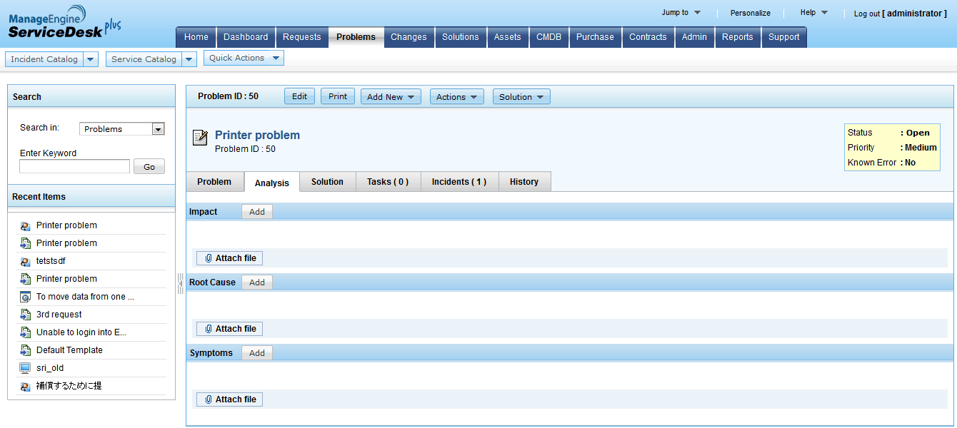 Problem categorization is very essential to avoid ambiguities. ServiceDesk Plus helps in applying the incident categorization automatically to a Problem when it is created and this helps in keeping the Problem technicians in the same level of understanding as the Incident technicians. When the number of incidents raised is more, it might be a painful task to search these incidents and associate to the Problem. The categorization makes it simpler to search the incidents and associate these with the Problem.