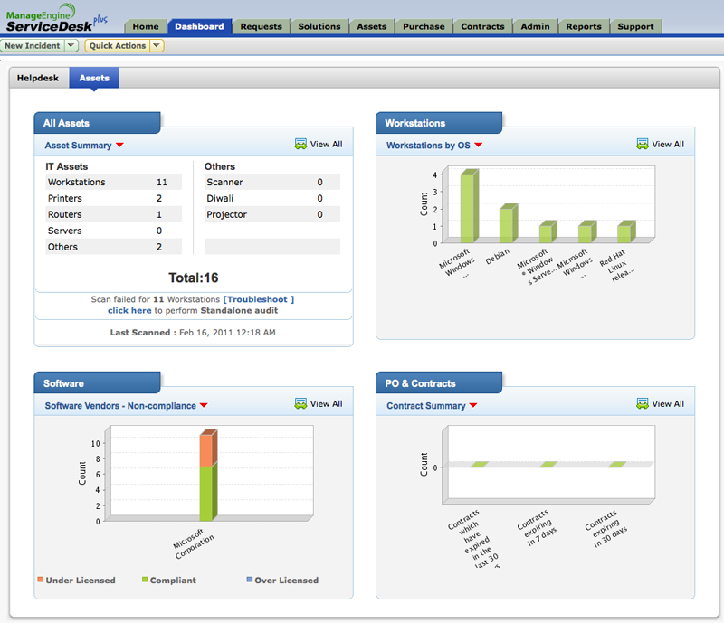 ServiceDesk Plus is a web based, easy-to-use help desk and asset management software which integrates ticketing, asset tracking, purchasing, contract management and knowledge base in one package and it acts as an operational bridge of all these various system management modules.