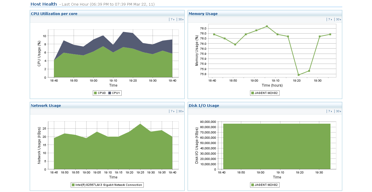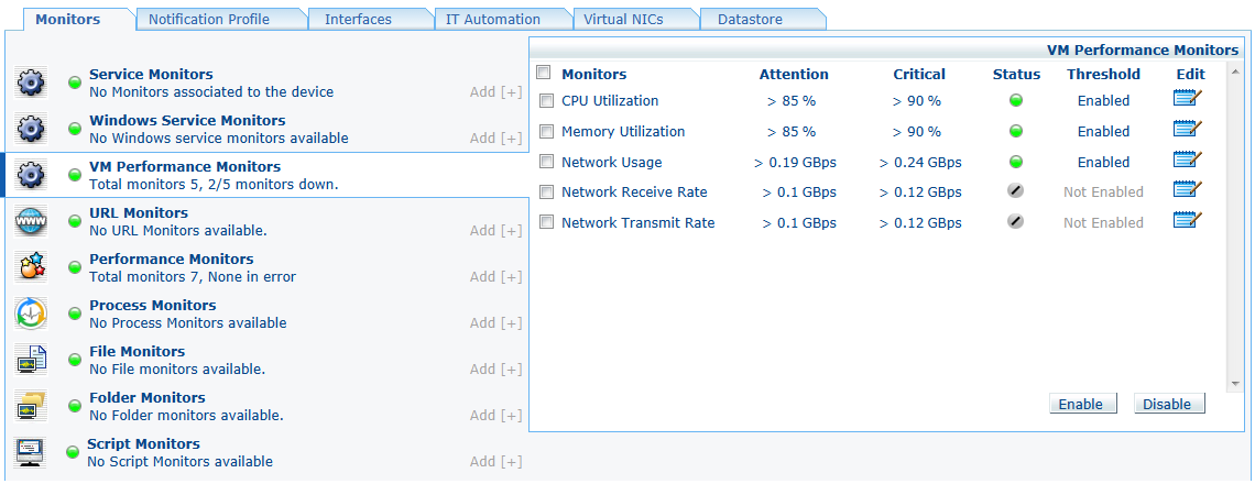 针对Hyper-V监控,OpManager内建超过40个和CPU、内存、磁盘和网络相关的监控器,帮助您监控Hyper-V主机和客户计算机。管理员可以为这些监控器设置阈值,在阈值被违反时即时获取通知。