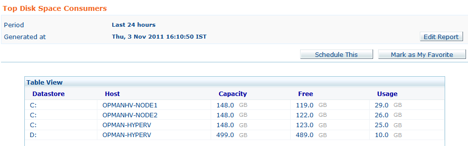 OpManager中的各种报表可以设置为计划报表,或者导出为其它的格式,如pdf、csv和xls,您可以按需直接生成自定义报表。无论何时何地,您都可以通过这些报表来了解您的Hyper-V虚拟架构的性能。