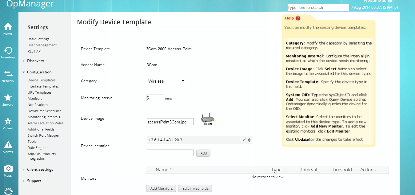 如果网络中包含大量的设备,分别对每个设备配置监控参数和间隔将十分麻烦。为此,OpManager提供了设备模板,每个模板预定义了一类产品的监控参数和监控间隔。OpManager默认支持600多种设备,每个设备类型有一个模板。