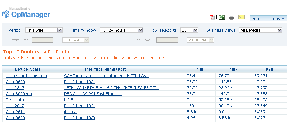 OpManager提供一个功能多样的报表框架,内建100多个报表。这些报表包括服务器报表、路由器报表、交换机报表和服务报表等。 每个报表都可以导出和保存为PDF/XLS文件,或者打印出来,也可以通过邮件发送给其他人。 您还可以通过报表的各种选项,创建自定义的特制报表,如选择“排行前N的报表”、修改报表的时间段、修改报表的业务视图来查看特定一组设备的数据等。