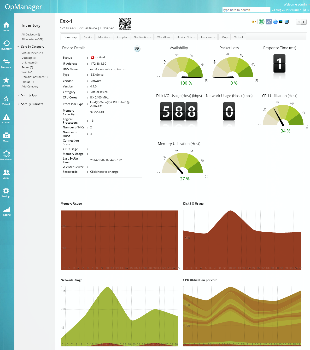 随着时下越来越多的应用和服务移植到数据中心,虚拟化和服务器的集群为IT管理员创造了新的管理难题。 OpManager提供一个单一的管理控制台,帮助IT管理员深入的、可视化的管理物理和虚拟服务器。