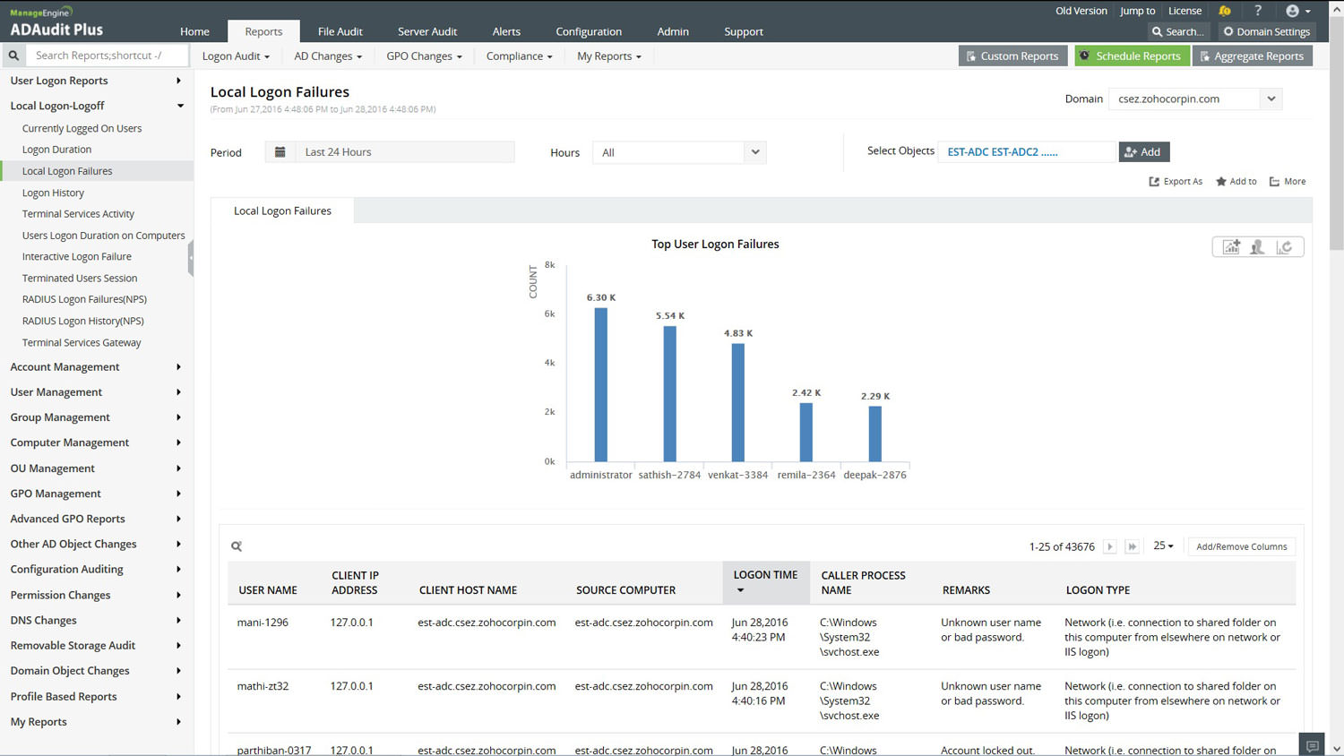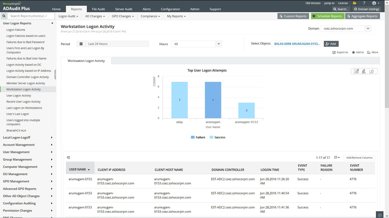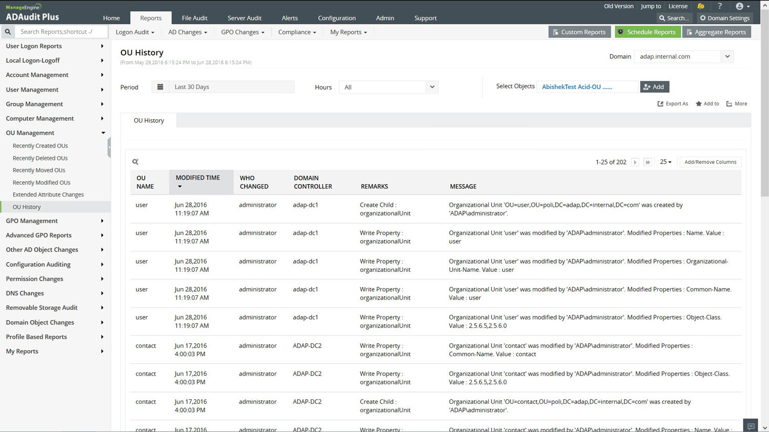 使用来自以上任一Active Directory审计报表的报表创建新报表配置文件。选择要审计的对象操作。而且,选择域和其中要与报表配置文件关联的对象。 |