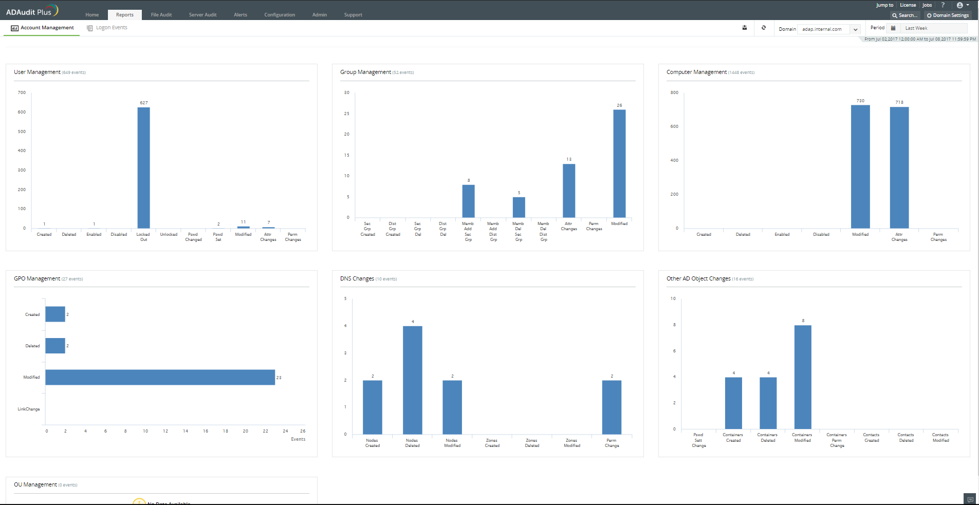 ManageEngine ADAudit Plus提供了各种预定义的概览报表,可汇总Windows Active Directory环境中的数据并提供集中概览。这是200多个预定义报表的补充。 现在,Windows server管理员可以查看Windows Active Directory中每个活动的更改总结,以及点击查看定期网络安全分析和满足各种合规要求的深入分析。