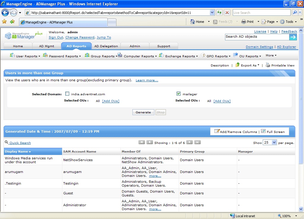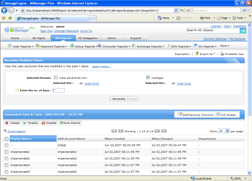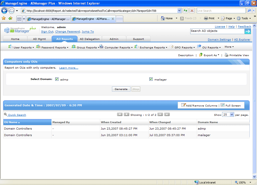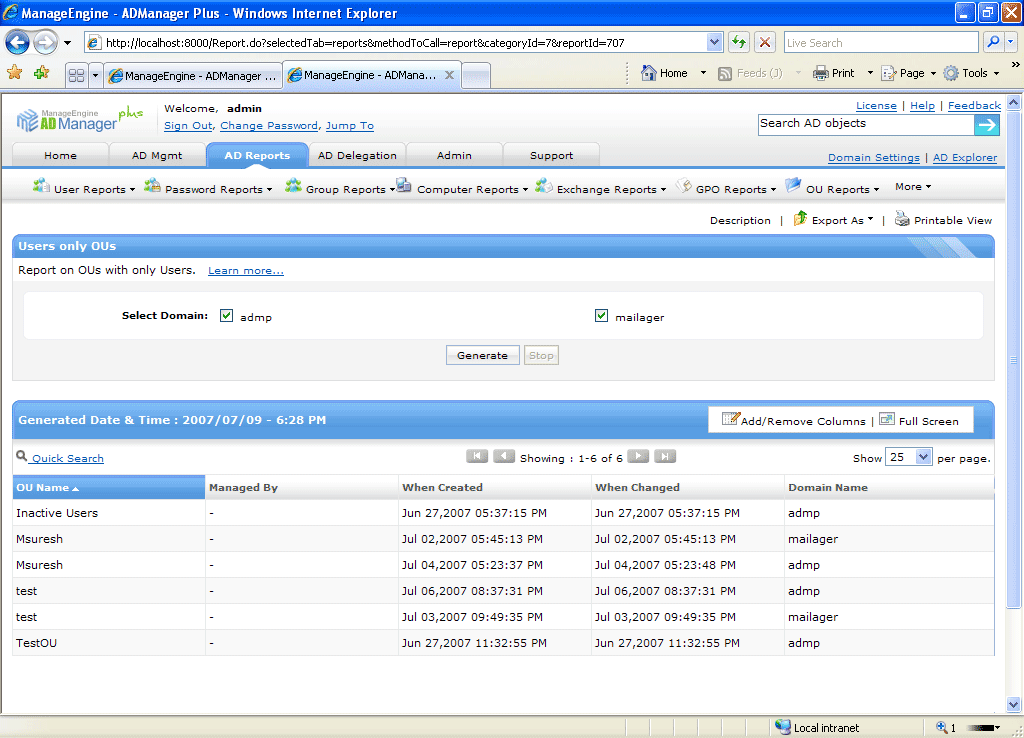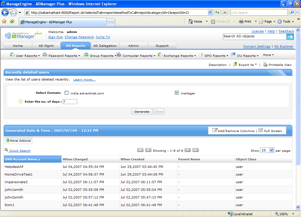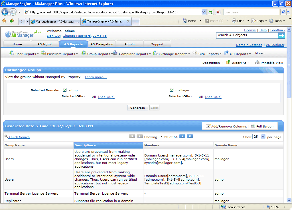 ADManager Plus提供超过150个预定义的报表,让您只需点击几下即可查看重要信息。您甚至可以配置报表自动生成并发送到特定电子邮件地址。此外,您还可利用其导出选项将所需的报表导出为所选的格式:PDF、excel、CSV、CSVDE或HTML。ADManager Plus的报表是可付诸实施的,也就是说,您可以直接从这些报表内执行所需的管理操作。例如,在查看AD环境中的不活跃用户时,您可以选择禁用它们。这些报表还帮助您满足甚至超出SOX、HIPAA等的合规要求。