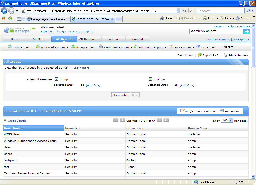 通过PowerShell生成报表涉及到编写许多长而复杂的脚本,让这个过程变得繁琐和耗时。ADManager Plus提供简单、基于GUI的备选方案,包括有关Active Directory、Exchange Server、Office 365、G Suite (G Suite)和Skype for Business (Lync)环境的报表。