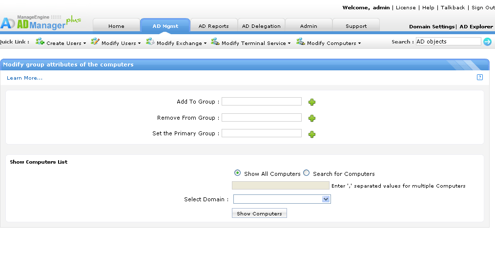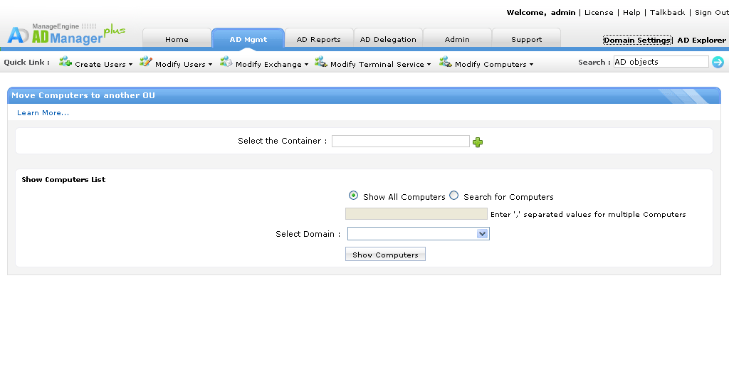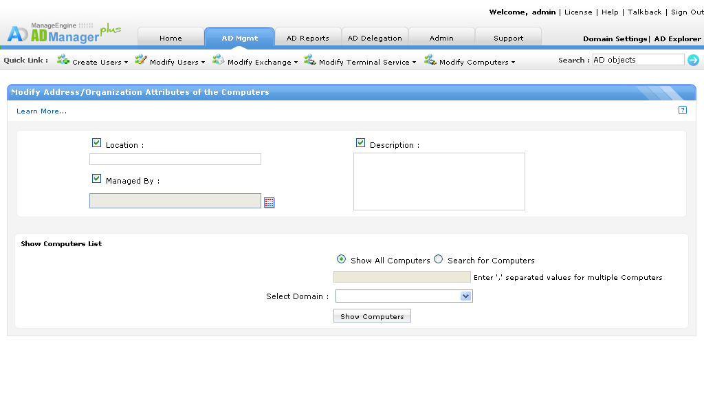 使用免费下载的ADManager Plus试用版本来探索所有计算机管理功能和选项。实际上,使用试用版本,您可探索此工具的所有功能,包括报表选项。