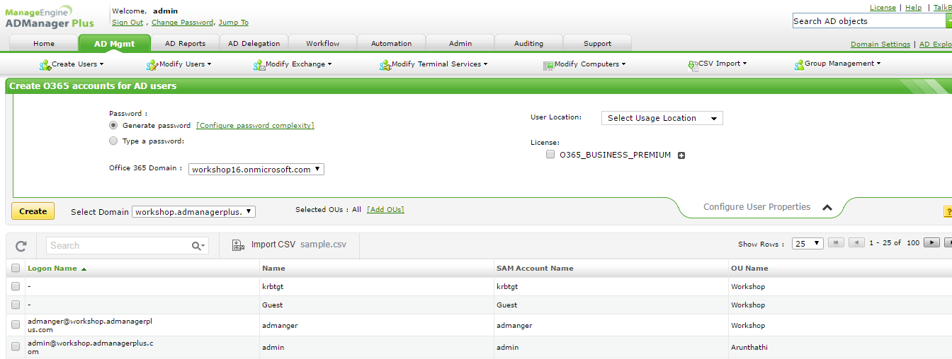 Provisioning multiple AD users in Office 365 is a breeze with ADManager Plus. Just import a CSV file to specify the AD users, and the tool sends those users' required attributes to Azure Active Directory-based Office 365 to create their Office 365 accounts.