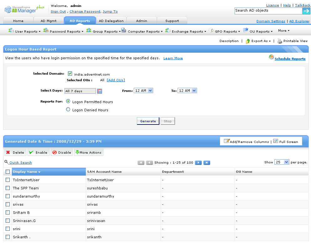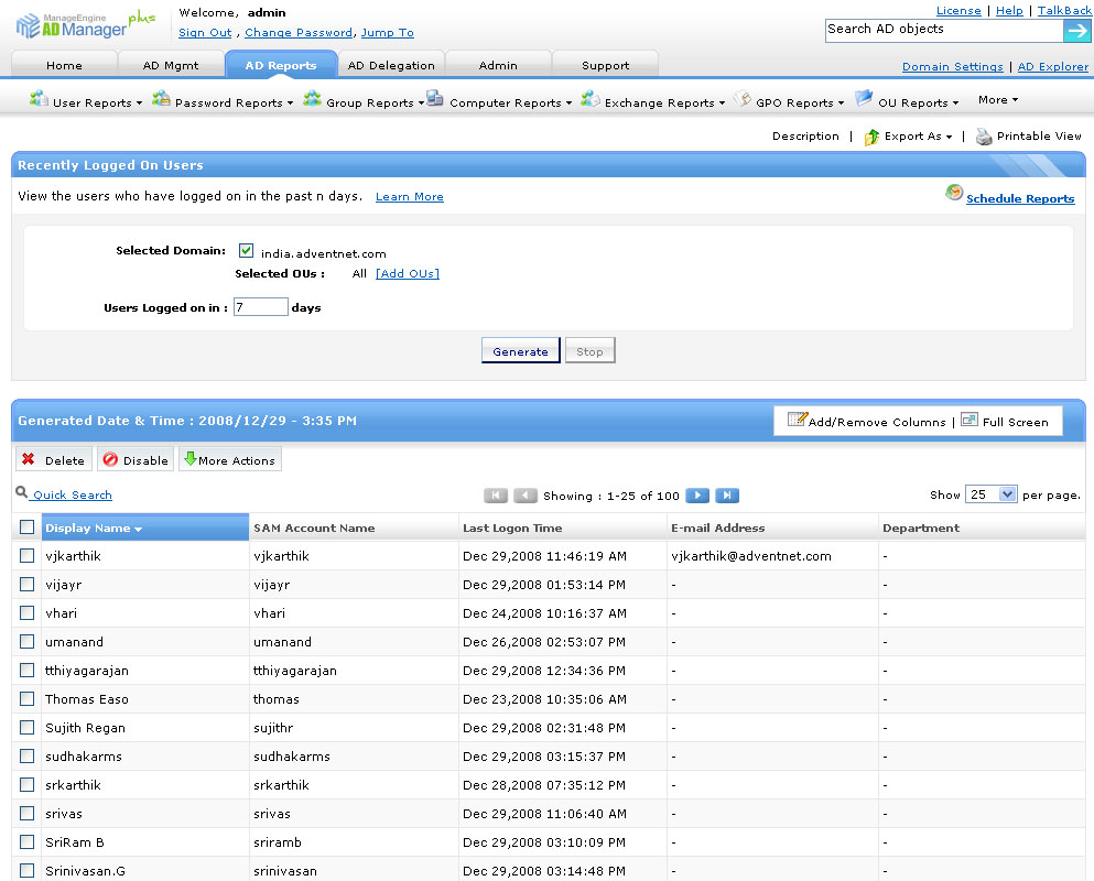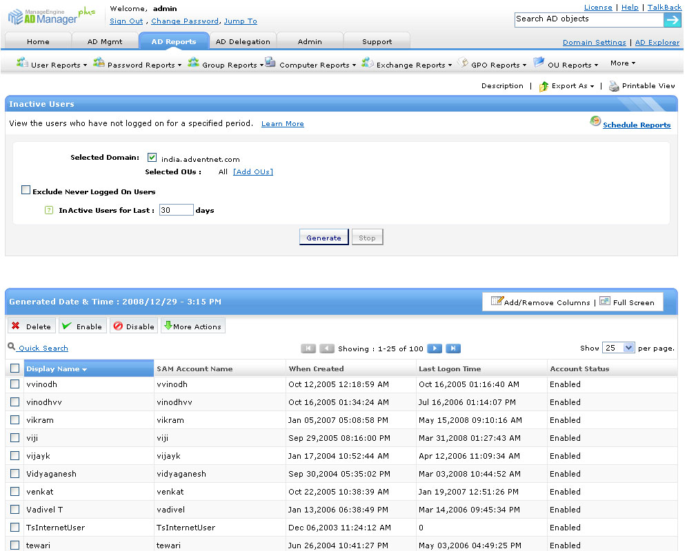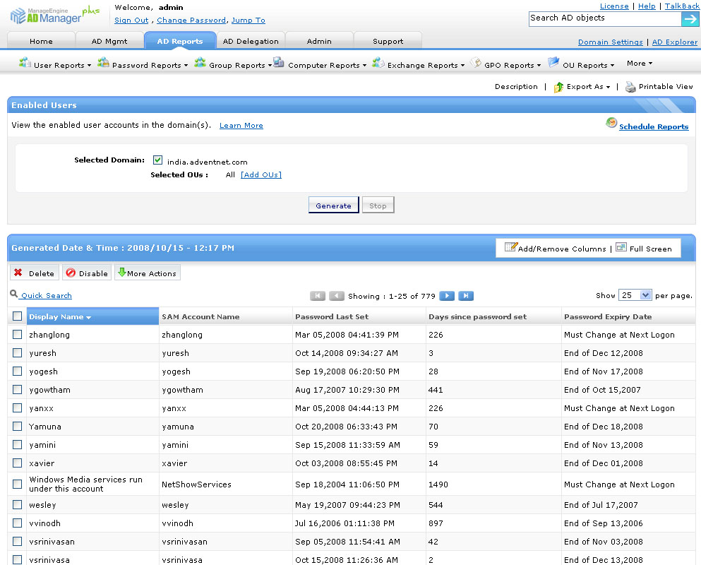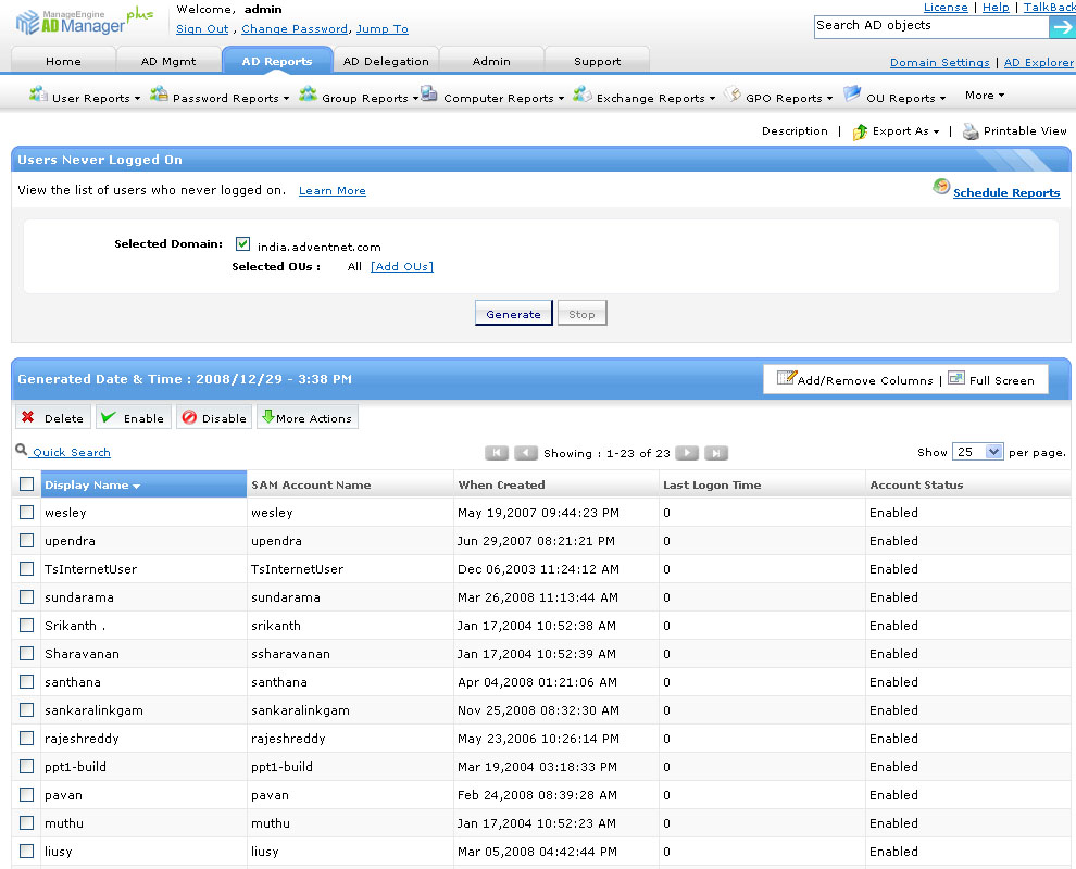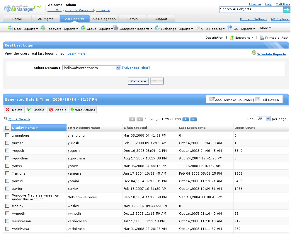 此工具还通过其‘从报表管理’功能提供简化的Active Directory管理,让您可以直接从报表中执行用户管理任务,例如启用、禁用、解锁、删除用户账户。ADManager Plus还可当作有效的自动Active Directory管理和报表工具。其亮点是:只需通过基于GUI的操作就可以实现所有这些功能,甚至不需要编写一行脚本。
