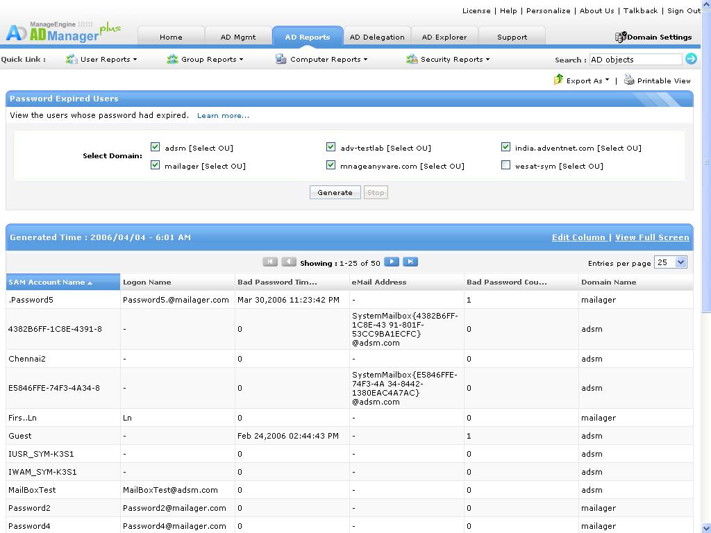 它很重要,可让Windows Active Directory管理员知道用户密码已过期。ADManager Plus的报表组合中的“密码已过期的用户报表”让您可详细查看密码已过期的所有Active Directory用户。