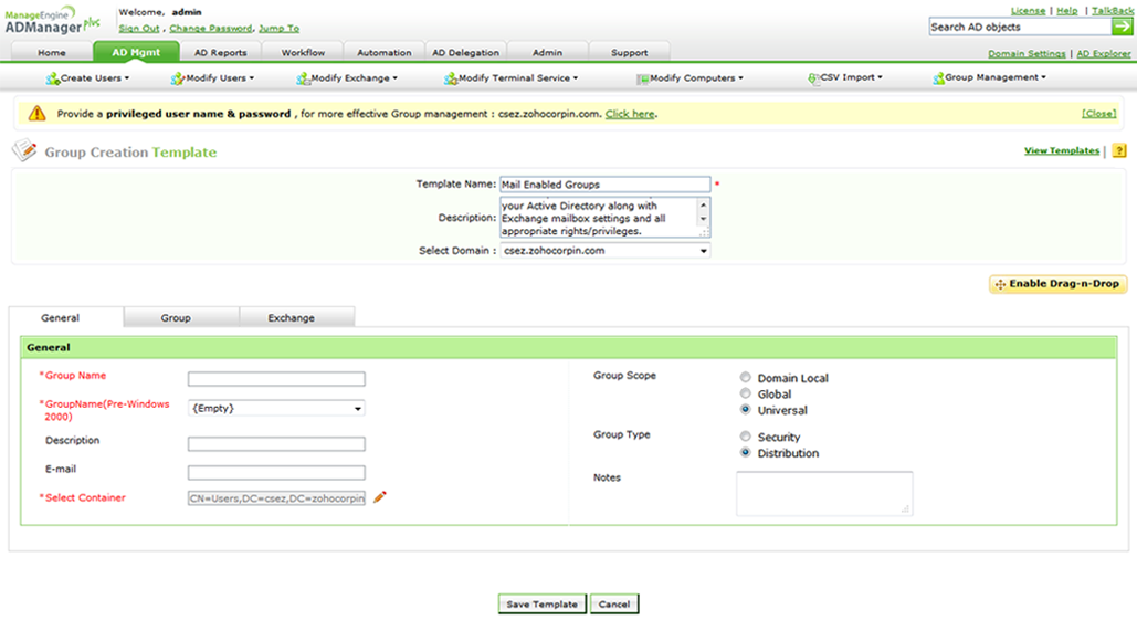 Active Directory组创建模板可带来管理优势,因为它们通过其与众不同的功能让组配置变得简单,可以配置新组及所有适合的属性或设置,还可以一次性将成员添加到组中。换句话说,只需在创建组时应用适合的组创建模板,您就可以配置: