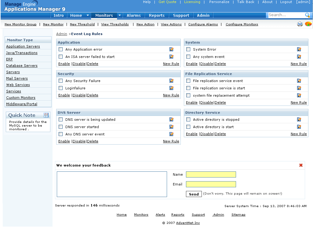 ManageEngine® Applications Manager可用于监控各种Windows事件。通过配置事件日志规则可以生成告警。