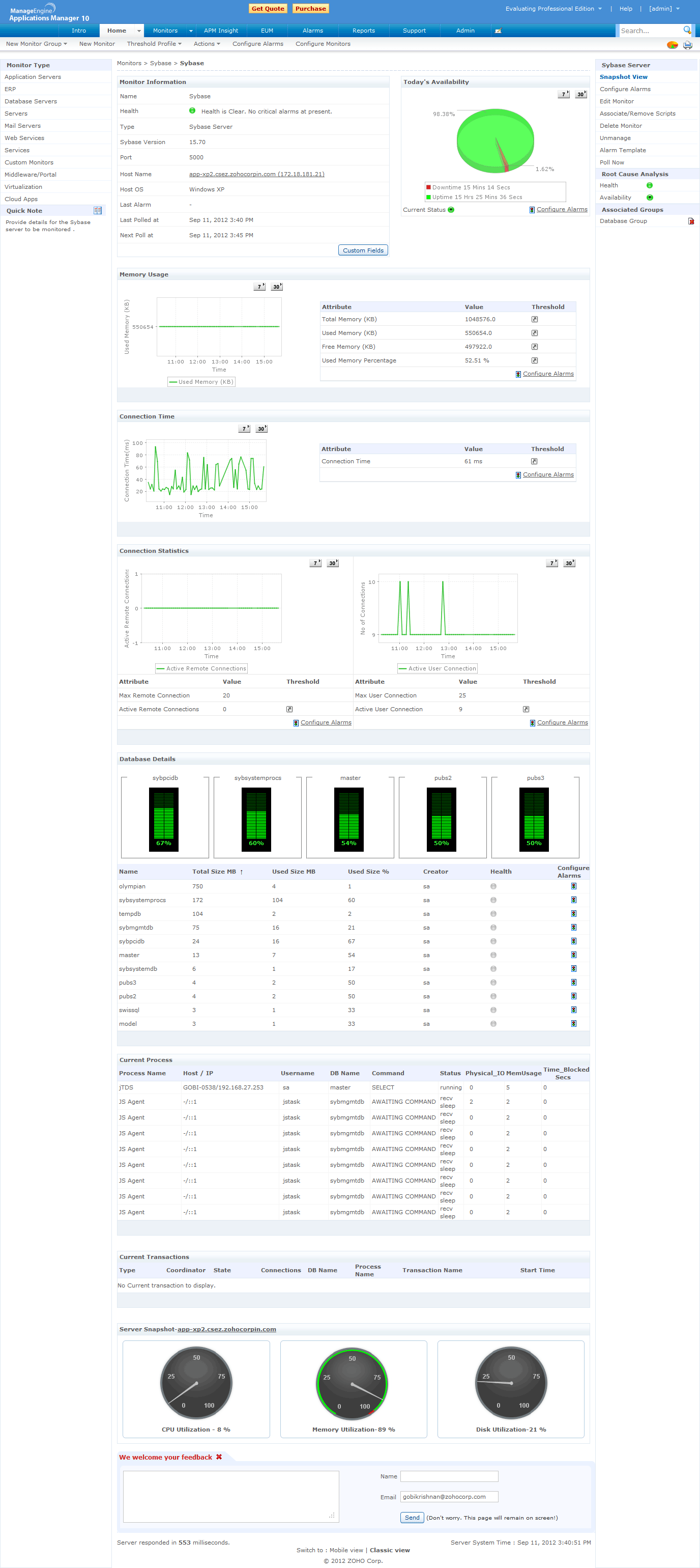 Applications Manager具有web客户端,允许从任何位置查看Sybase监控数据。根本原因分析窗口有助于操作团队尽快排除性能问题。此外,分组功能帮助你基于支持的业务流程,对数据库分组,便于操作团队接收到 告警时,优先处理重要的告警。