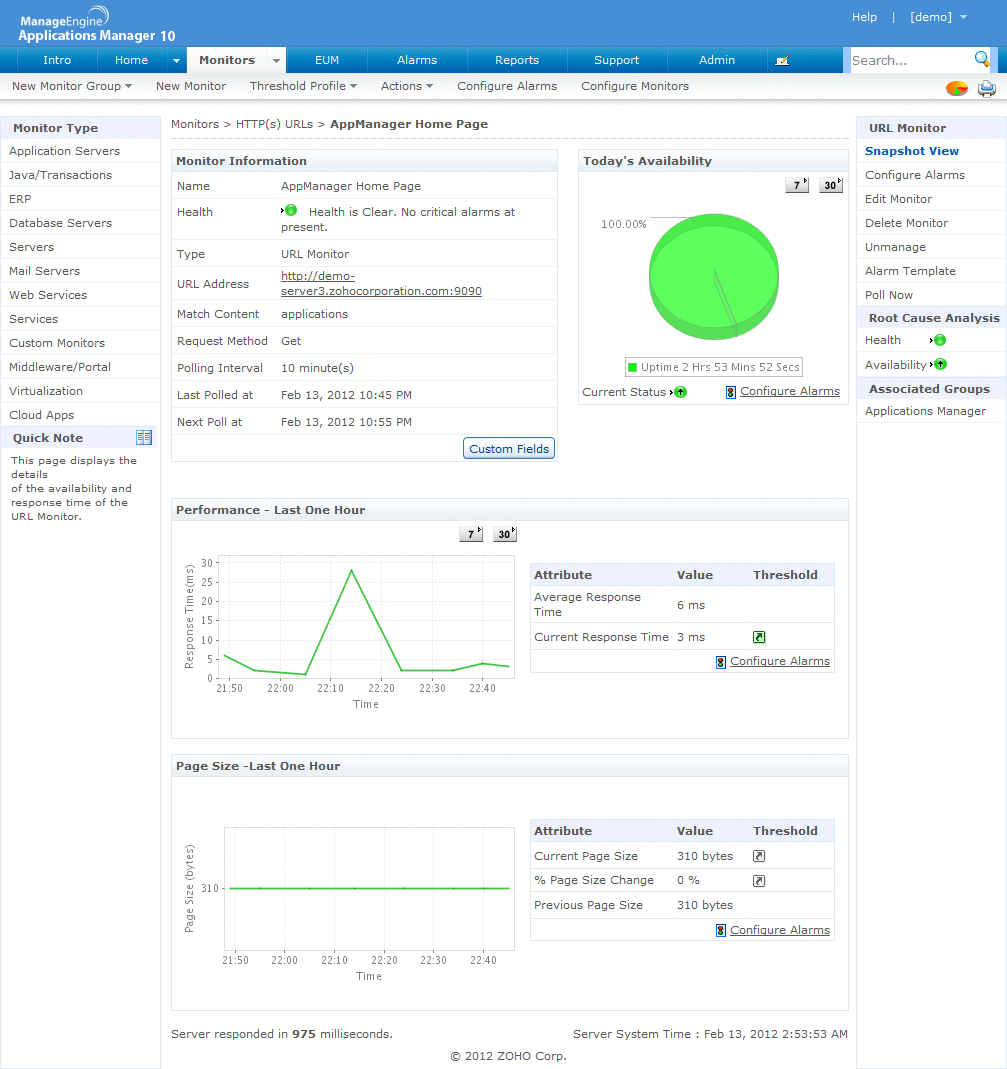 即监视web应用的网页的性能和可用性。Applications manager能够检查网站的页面能否被访问,如果不能访问,将发送通知并触发纠正措施。网站性能监视能检查诸如应答时间等多种属性。例如您可以添加一个URL,如http://mycompany/estore.jsp, 以对其进行监视。您还可以为某个网页设置阈值,例如:如果该页面的 加载时间大于5秒,就通过e-mail或SMS发出通知。这有助于在最终用户受到影响之前快速采取措施。