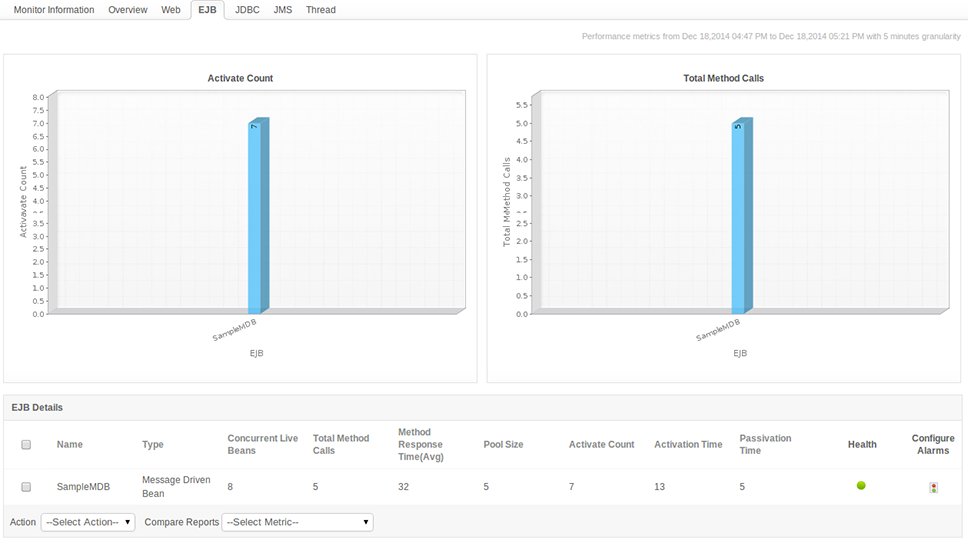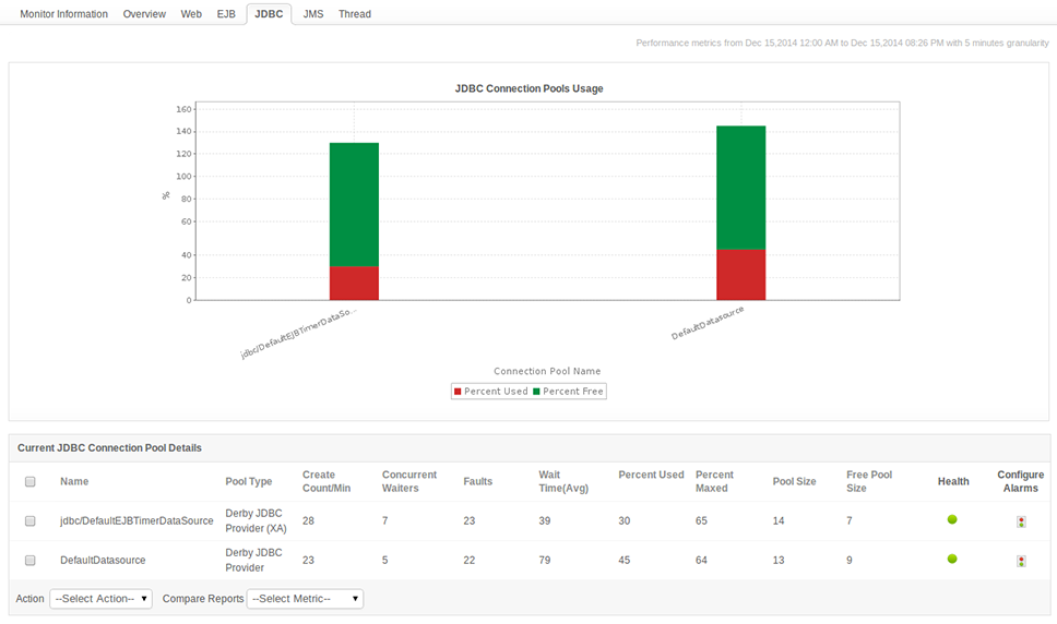 监控WebSphere应用服务器的可用性、健康状况和性能。通过计算CPU/内存使用、JVM使用和响应时间,确保资源合理分配。跟踪包括实时会话、Enterprise Java Beans (EJBs)、JDBC连接池、JMS队列等重要性能指标。