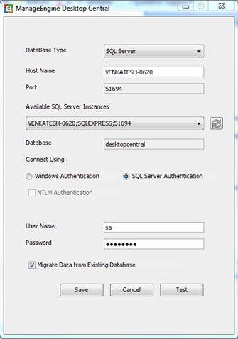 Note : Desktop Central Supports MS SQL 2005 or later versions.