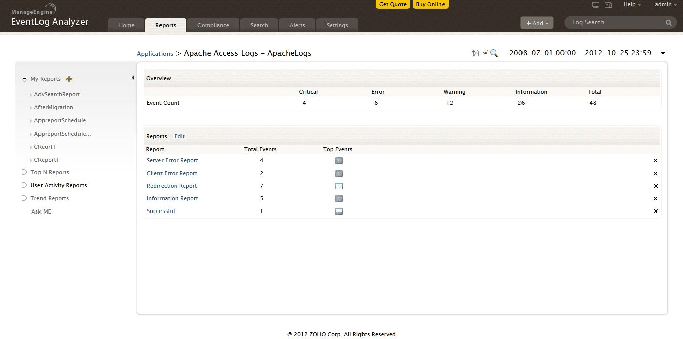 EventLog Analyzer执行有效的IIS Web服务器应用程序日志分析,提供预定义的报表,该报表提供关于Web服务器上发生的HTTP错误、安全攻击、恶意URL请求等信息。 此应用程序日志分析和报表工具还提供针对IIS Web服务器的SQL注入攻击、DDoS攻击和跨站点脚本攻击的实时告警。了解更多 » |