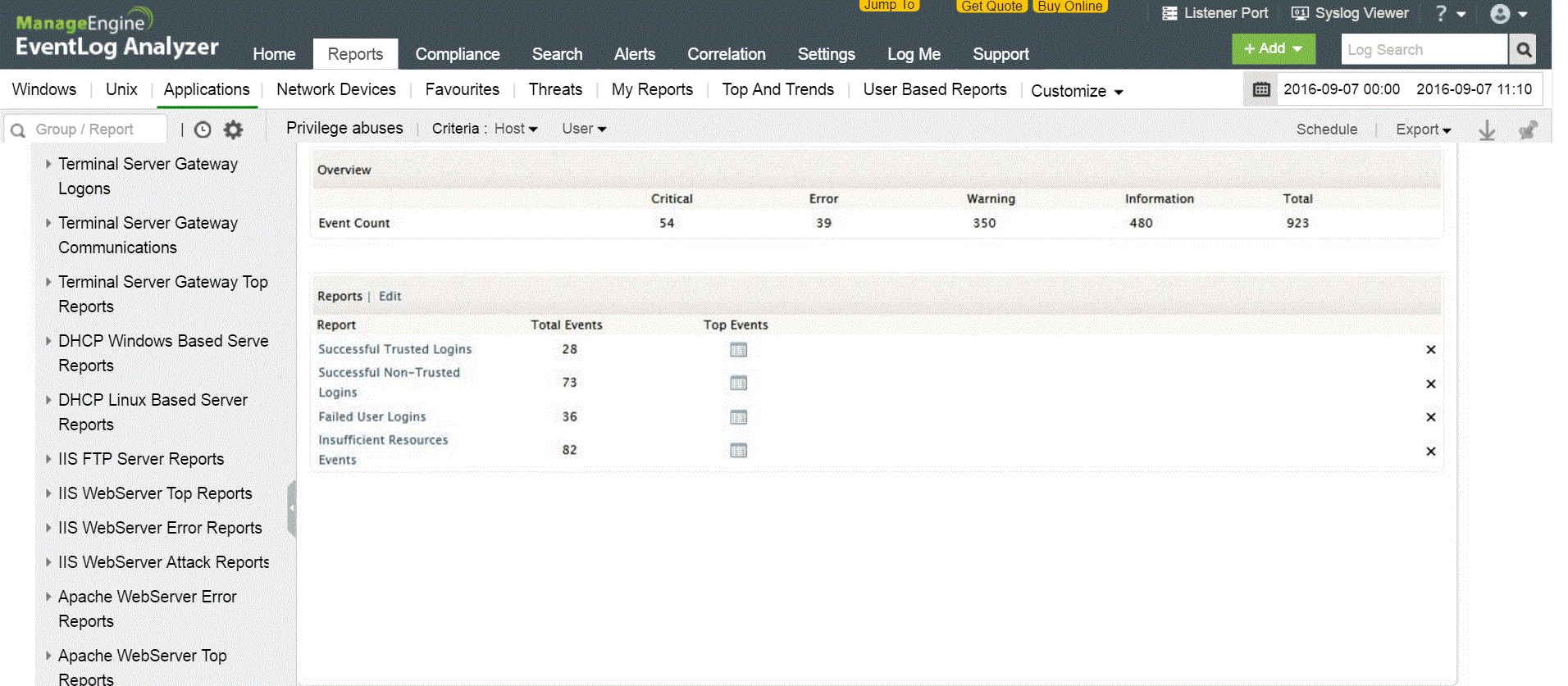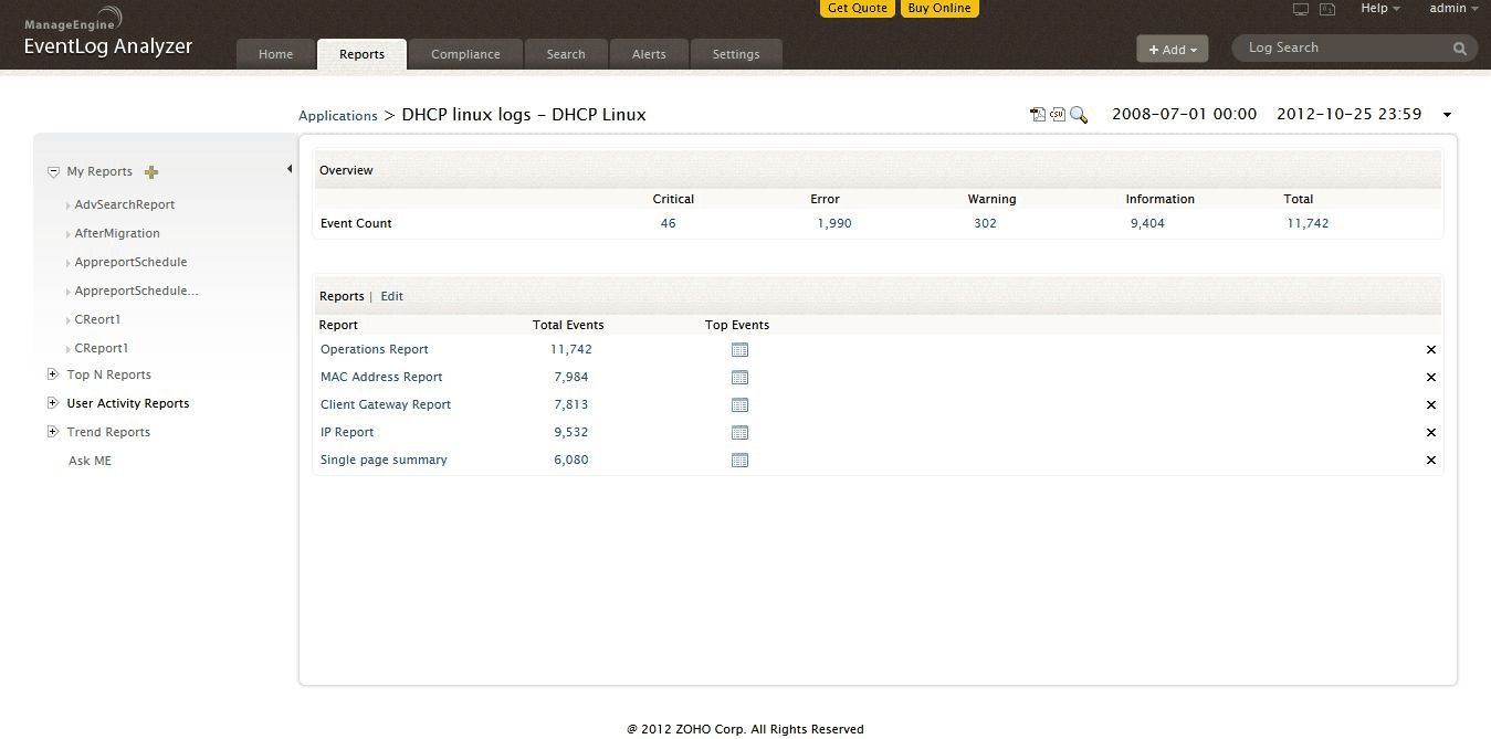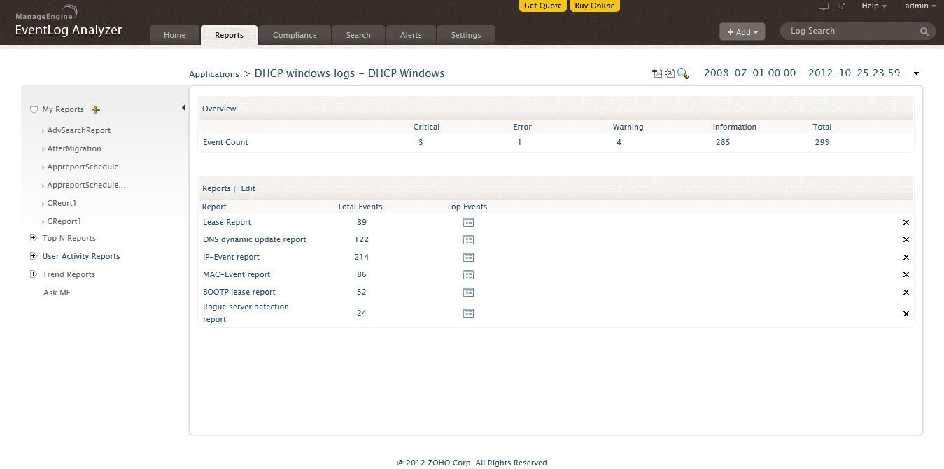 EventLog Analyzer 审计Windows DHCP服务器。在将DHCP服务器添加到EventLog Analyzer后,将自动生成预定义报表,这有效地减少了通过冗长的日志进行审计的任务。这也有助于生成基于排列在前的客户和错误频率的报表。了解更多 » |