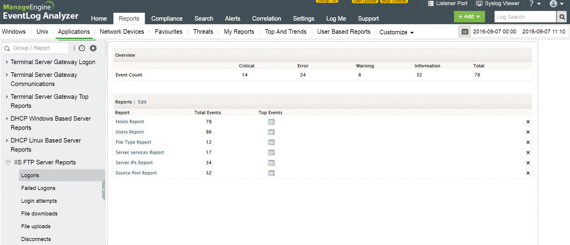 EventLog Analyzer收集、监控和跟踪IIS FTP应用程序服务器日志。它提供了有关用户访问IIS FTP服务器、文件上传、下载、文件传输详细信息等项的详细报表。这一IIS FTP服务器应用程序日志分析和报表工具还带有预置告警控制台,用于发送失败下载和关键文件传输的实时通知。了解更多 » |