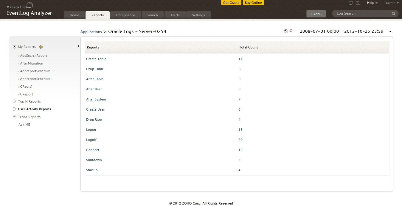 EventLog analyzer有助于简化基于实时Oracle日志收集、监控、跟踪和生成报表的过程。 还提供无需额外配置的现成报表,它们以直观图形的方式展示出日志的重要统计数据。这有助于减轻SQL注入和DoS等攻击。了解更多 » |