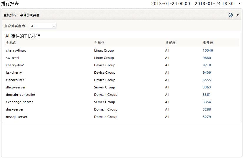 此报表根据重要度显示主机的排行,并显示所有事件。这就是说,您可以一眼看出主机的关键事件,告警事件,等等。默认情况下,查看重要度的值设置为全部,任何重要度的事件都会被显示出来。