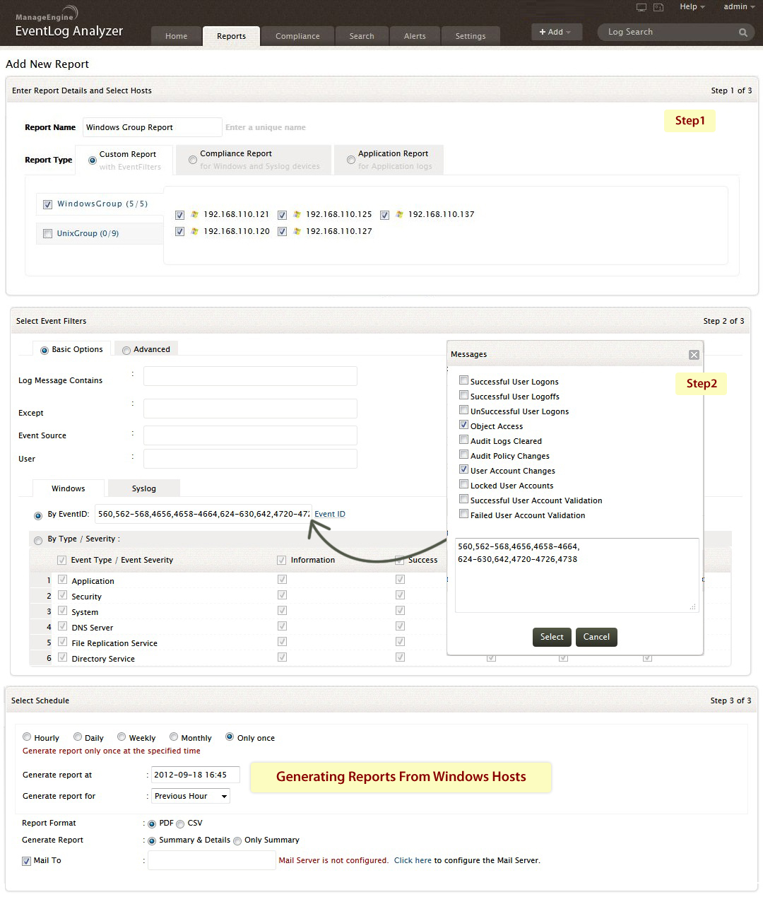 您可使用EventLog Analyzer来利用各种条件在生成事件日志数据的Windows计算机上生成自定义报表。这些条件为:日志消息、用户、事件ID和事件类型/严重性。