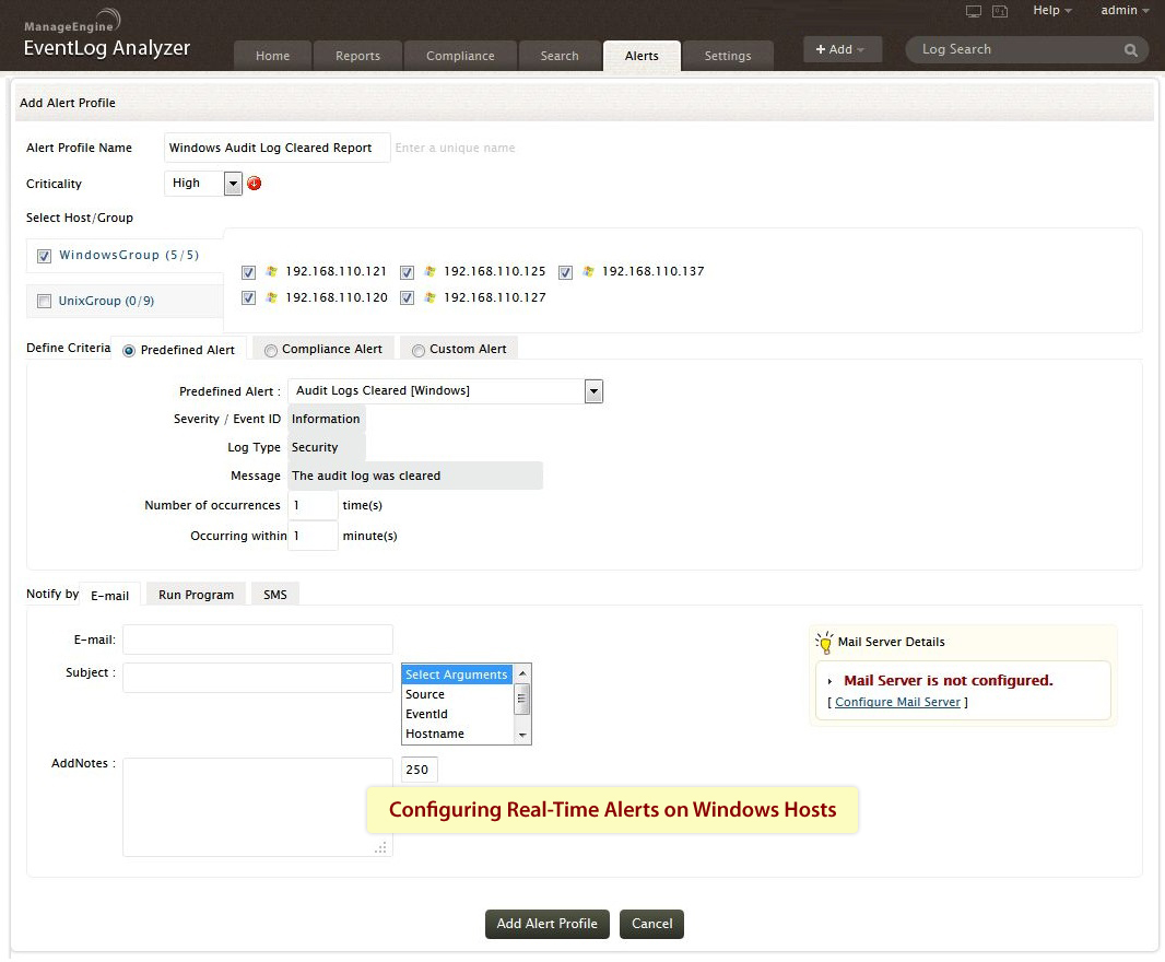 EventLog Analyzer可针对事件日志生成实时告警,这样在生成满足特定条件的事件时,管理员会收到通知。告警可帮助管理员实时监控Windows网络上的关键服务器和流程。