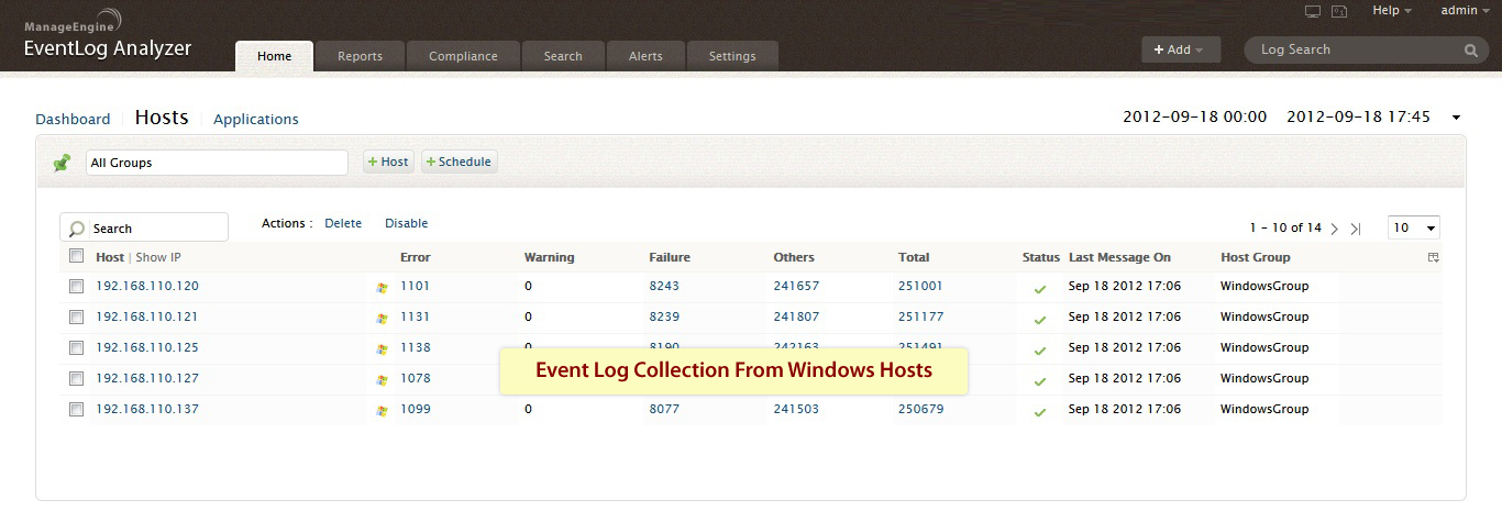 对于事件日志收集,此事件日志监控软件不需要在收集日志所在的每台机器上安装单独的代理。EventLog Analyzer使用无代理日志收集技术以收集Windows事件日志数据。