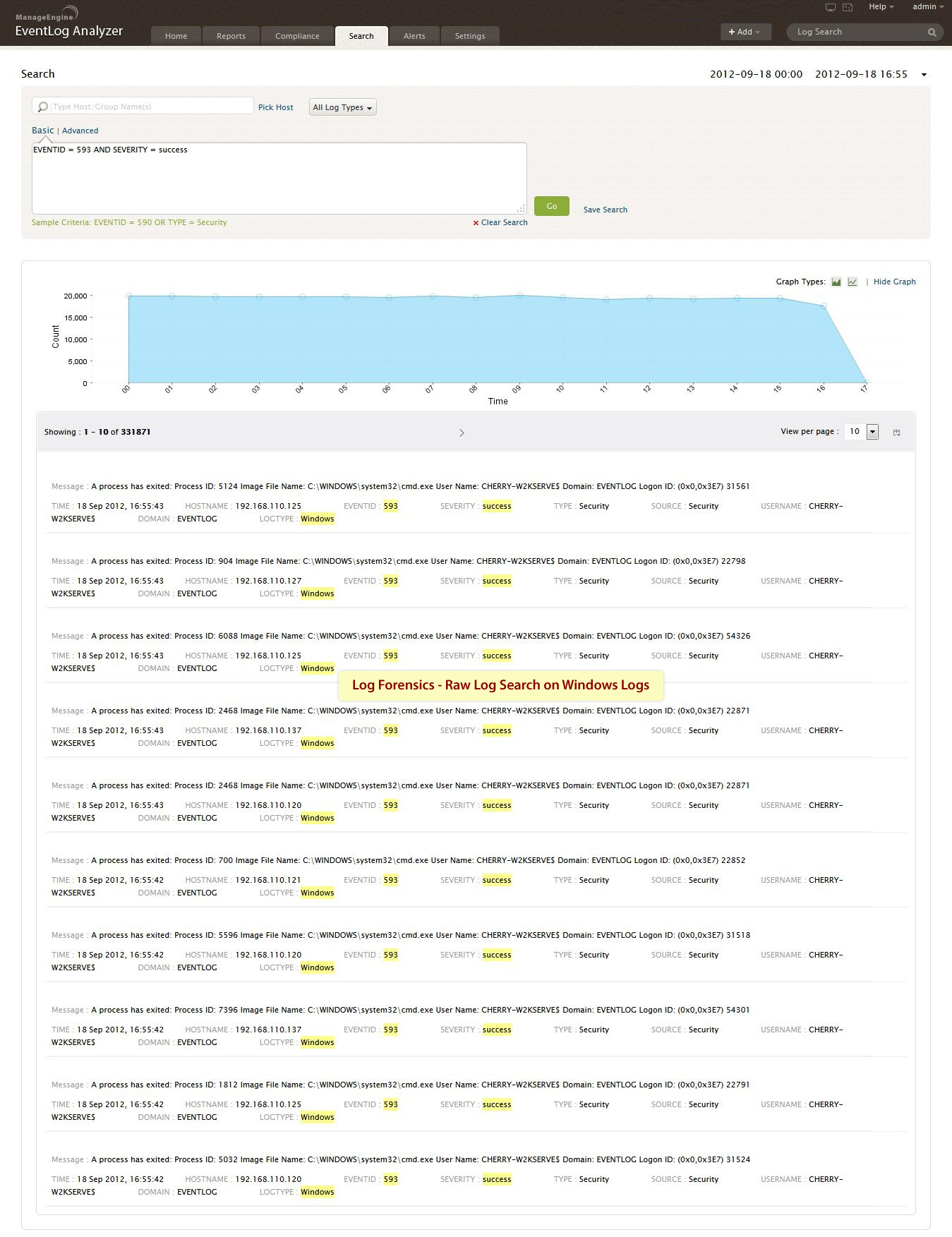 EventLog Analyzer通过以下方式让事件日志取证调查变得非常简单:允许您使用其强大的搜索引擎同时对原始事件日志和格式化事件日志进行搜索,并根据搜索结果即时生成取证报表。网络管理员现在可以搜索原始日志并准确找到导致发生安全活动的确切日志条目,查找相应安全事件发生的确切时间、谁启动该活动,以及该活动发起的地点。