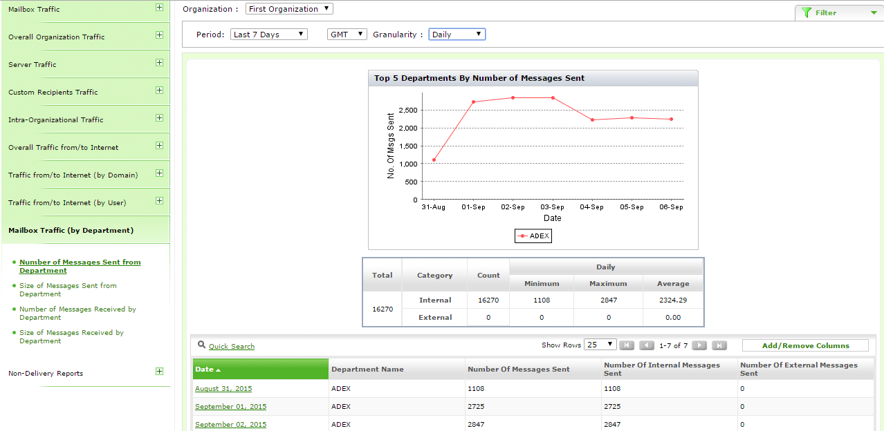 使用这些报表获取有关各部门邮件活动的详细信息。您可以根据您的需求,监控业务和非业务时间的流量。这些报表在服务器版本2003、2007、2010、2013和2016上进行配置。这些报表也可导出至目标位置,或以CSV、PDF (Adobe Acrobat)、XLS (Excel)和HTML等格式以电子邮件的形式发送给您。