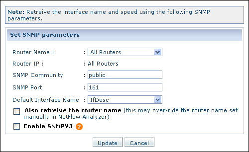 为了使NetFlow分析仪可以成功的轮询路由器,用户需要在NetFlow分析仪中设置SNMP V3证书。 在"接口视图"页面,点击"设置SNMP", 在右方界面 "路由器名"的旁边。