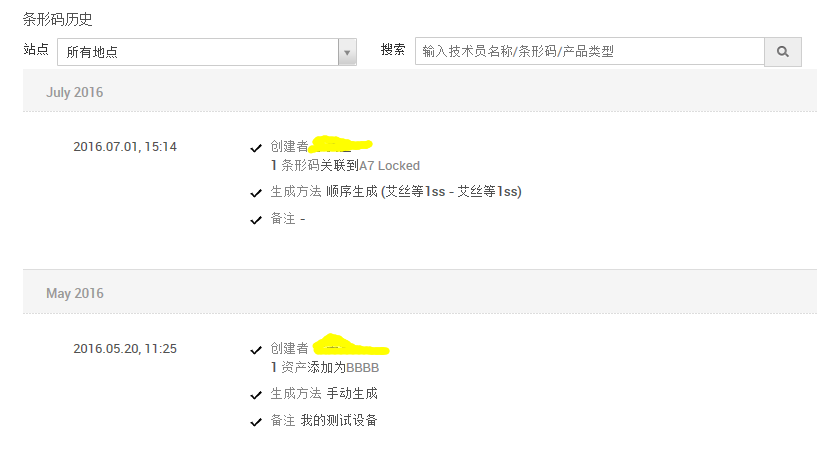 历史选项可以允许您查看资产的条形码生成历史。可以通过地点、条形码、产品类型等进行搜索。