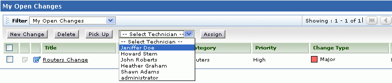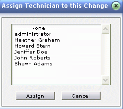 点击动作 -> 从列表选择指派技术员,弹出“为该变更指派技术员”页面,如下图所示。从列表中选择技术员,将变更指派给技术员。