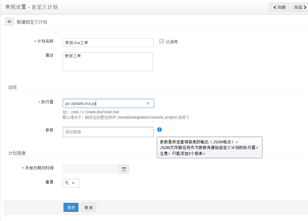 自定义计划可以按照计划设置的日期和时间,定期或不定期地执行指定的动作。每个自定义计划可以将关联的查询报表作为其变量,传递给脚本文件。这样,通过查询报表,即可访问ServiceDesk Plus中所要的数据。